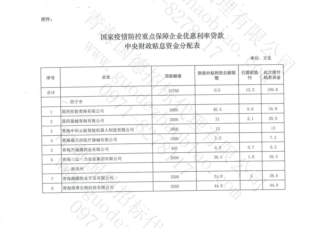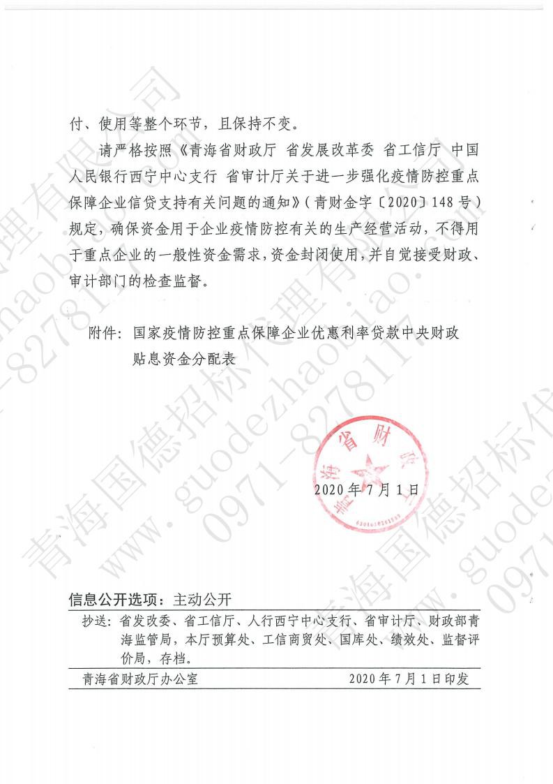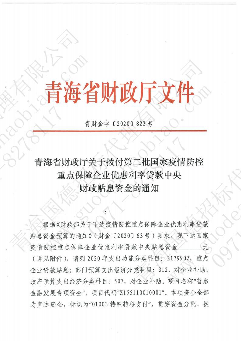 青財金字[2020]822號 青海省財政廳關于撥付第二批國家疫情防控重點保障企業優惠利率貸款中央財政貼息資金的通知
