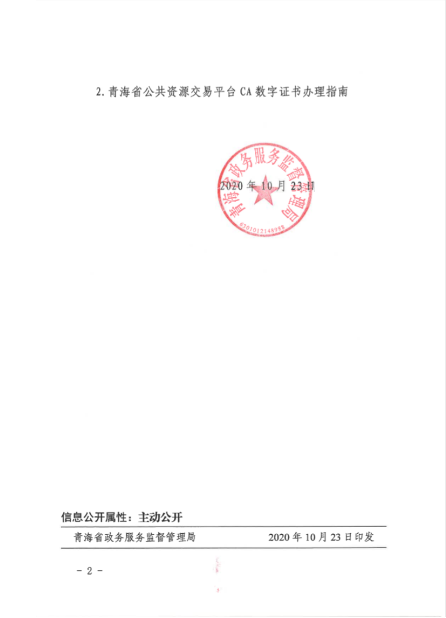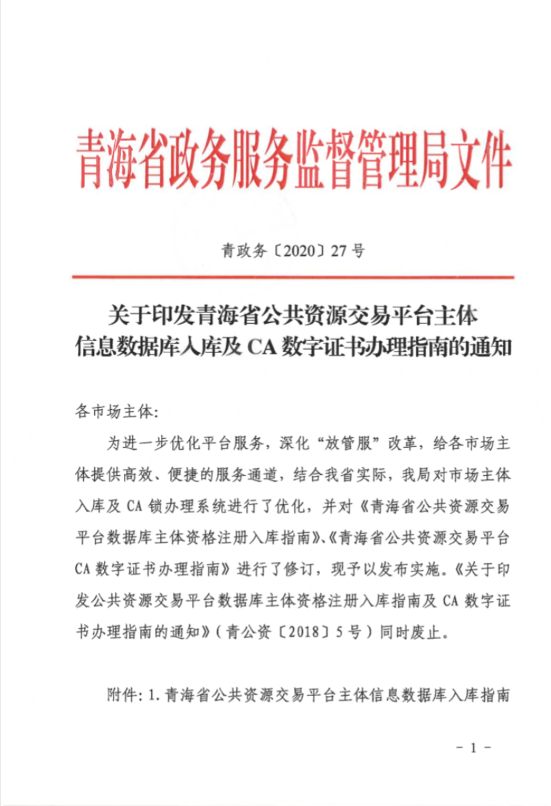 關于印發青海省公共資源交易平臺主體信息數據庫入庫及CA數字證書辦理指南的通知