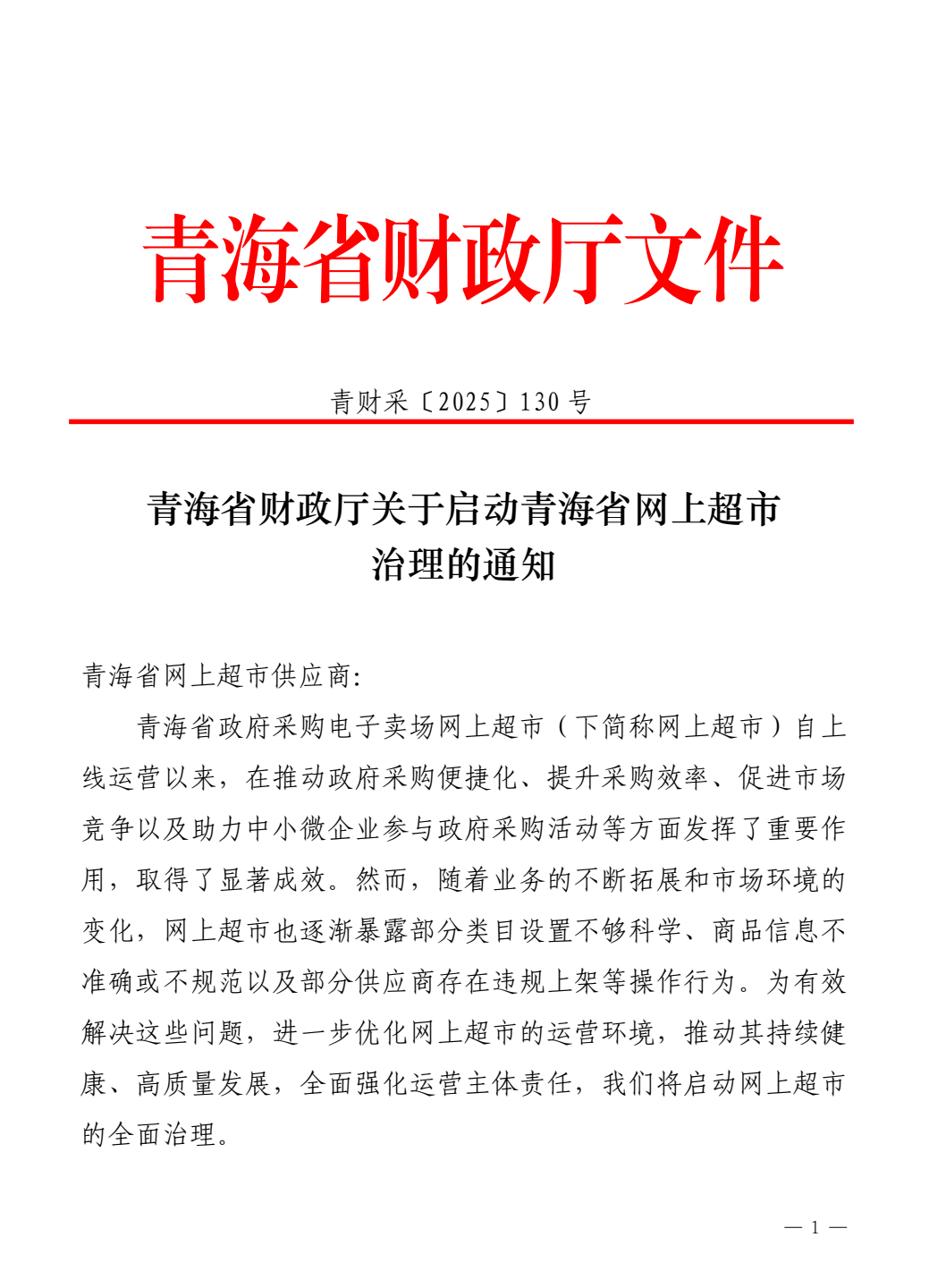 青海省財政廳關于啟動青海省網上超市治理的通知